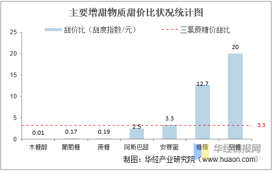 资料来源:公开资料整理 三氯蔗糖发展背景 相较于蔗糖、人工甜味剂成本低。通常情况下,甜味剂的性价比以‘甜价比’来度量,定义蔗糖的甜度为1,通过比较发现,相同价格下,人工甜味剂甜度均在蔗糖的10倍以上,人工甜味剂的加入可以大大降低饮料产品生产成本。其中三氯蔗糖甜价比约为3.3。