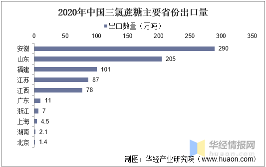数据来源:海关总署 随着科技的发展和消费意识的转变,人们对人工合成低热值、高甜度甜味剂的需求正在不断的增加,更为安全卫生、品质上乘、风味自然的产品势必取代老一代的产品,三氯蔗糖产品的这些特性,恰好满足了这一时代发展的需求。就中国三氯蔗糖主要出口来源省份分布来看,主要以安徽、山东为主,占比总和为57%左右,其中安徽最高,2020年产量为290万吨,约为6700万美元,山东排名第二,产量为205万吨。