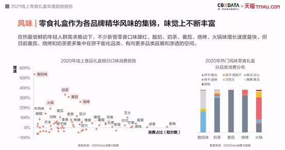 当下的休闲食品行业,消费者所追寻的“独特味觉体验”促使产品口味持续创新,而体验的增强可通过许多方法,或是提升产品风味的丰富性,或是创造神秘口味吸引消费者注意力。 “消费升级的时代,仅仅具备安全、健康、口感好等特性的休闲食品已然是最基础的,追求刺激的消费者更容易被新口味产品吸引,这也就是为什么季节限定口味产品和地域风味产品总能轻松获得消费者关注的主要原因。”一位行业人士如是说道。 事实也确实如此,当下,在消费者口味多样化需求的推动下,出现了诸多新晋口味,根据CBNData《报告》数据显示,近年来,酸奶、奶茶、番茄、烧烤、火锅味增长速度最快。而以近一年消费规模最大的坚果礼盒,以及增长最快的糕点礼盒为例,芝士味、虾味、烤肉味坚果蹿升最快,糕点品类中则是酸奶味、海盐味和葡萄味大行其道。