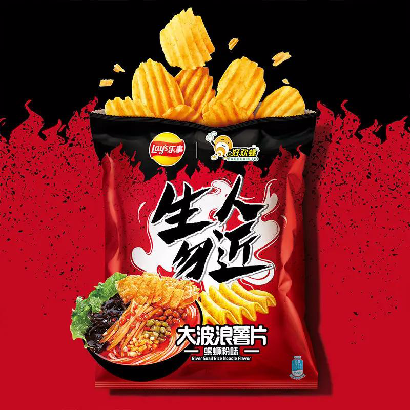 以The Daily Crave Beyond Puffs为例,作为一款膨化型纯素食零食,其由红扁豆、黑豆、木薯制成,共有四种口味:喜马拉雅粉红盐、切达干酪、白切达干酪和是拉差辣椒酱,其中,是拉差辣椒酱款作为辛辣口味创意零食,引得一众消费者纷纷尝试。 而在“臭味”这一风味上,灵感则来源近两年在中国本土大火的“螺蛳粉”,中国消费者为“螺蛳粉”疯狂:“闻起来臭,吃起来,啊~真香!” 国际食品巨头百事敏锐捕捉到这一“臭味”小风向,旗下品牌乐事则顺势携手中国本土螺蛳粉品牌好欢螺推出"螺蛳粉口味薯片",乐事大波浪与好欢螺完美结合也让一众消费者大跌眼镜。据了解,这款“生人勿近”薯片在延续了大波浪薯片厚实酥脆的口感的同时,还完美复刻螺蛳粉独特酸笋“臭”味,让消费者的猎奇时刻,每一秒都能感受到浓浓的酸笋“臭味”,十分上头。